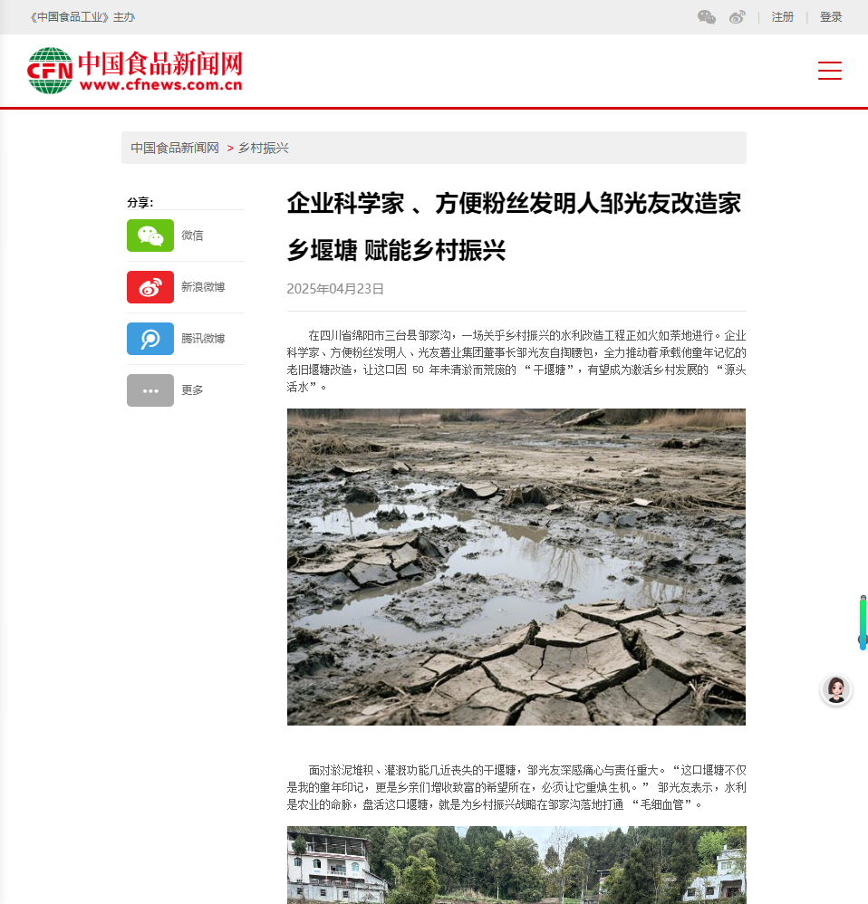 轉(zhuǎn)載中國食品新聞網(wǎng)——企業(yè)科學家 、方便粉絲發(fā)明人鄒光友改造家鄉(xiāng)堰塘 賦能鄉(xiāng)村振興